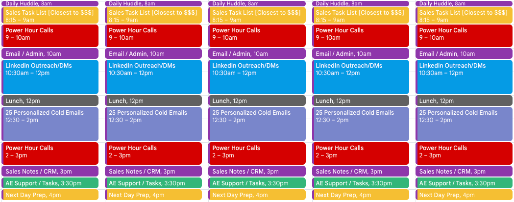 Some companies create a structured calendar that breaks down exactly what a perfect week looks like for an SDR: